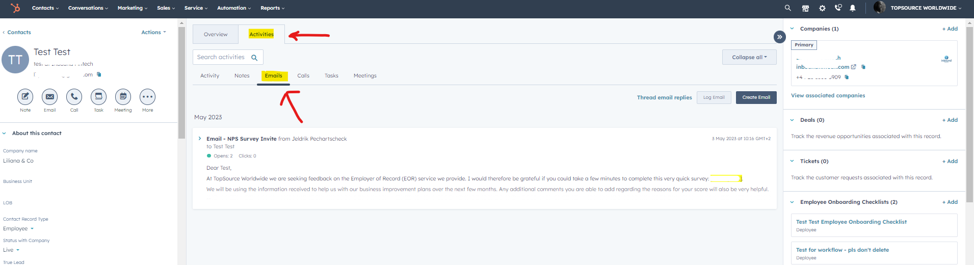 3. On the selected Contact record, navigate to 'Activities' then 'Emails' in the middle of the record