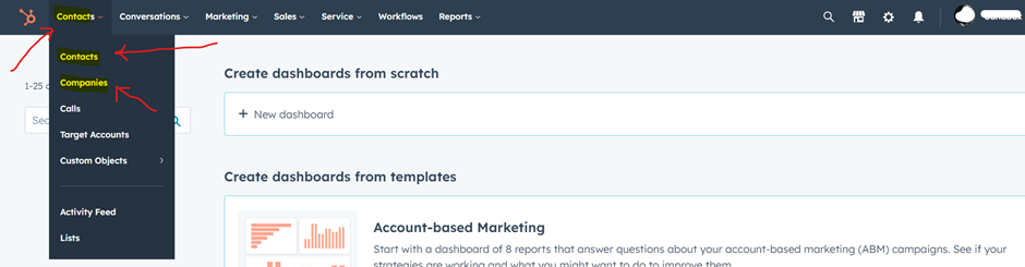 1. Click on the ‘Contacts’ Tab in HubSpot and select ‘Contacts’